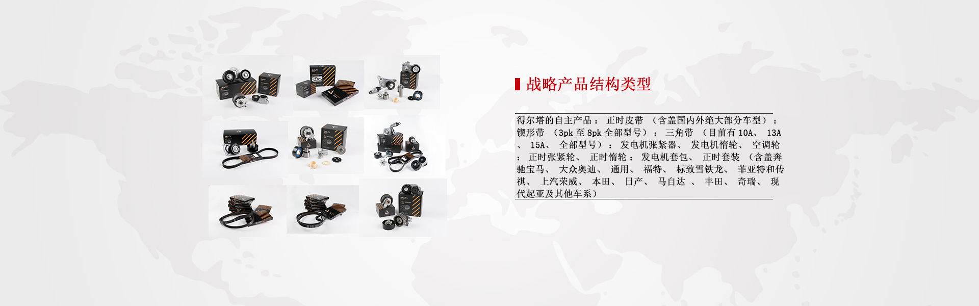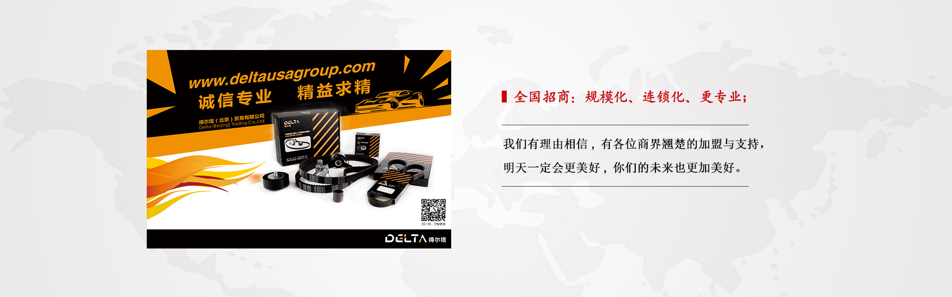 得尔塔(北京)贸易有限公司是于2016年筹备,2017年3月为美国DELTA USA Inc公司进入中国市场专门成立的贸易公司,公司致力于为大中华地区庞大的汽车配套,售后市场服务,本着“诚信专业 精益求精”的经营理念,结合美国DELTA USA Inc强大的技术实力和多年为汽车配套,售后服务所积累的专业基础。全力为大众化地区客户提供具有OEM品质的稳定货源,携手合作,共创未来!